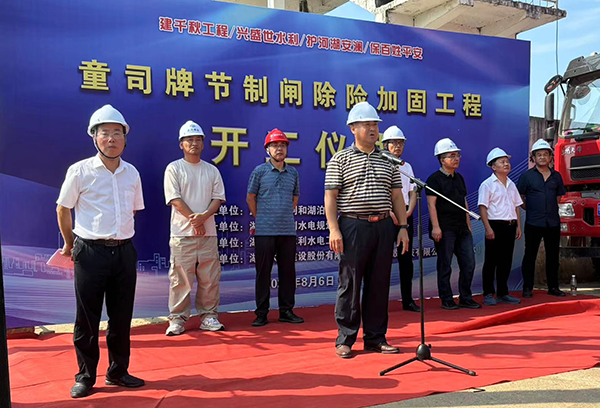 开工仪式上,郭丹东宣布童司牌节制闸除险加固工程正式开工。