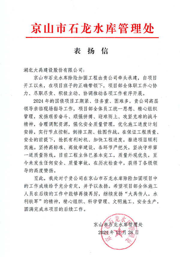 京山市石龙水库除险加固工程收到了京山市石龙水库管理处发来的表扬信,信中对公司项目部在工程质量、安全、进度上的优异表现表示充分肯定,对项目部团队在工程建设过程中的责任与担当给予了高度的赞扬!