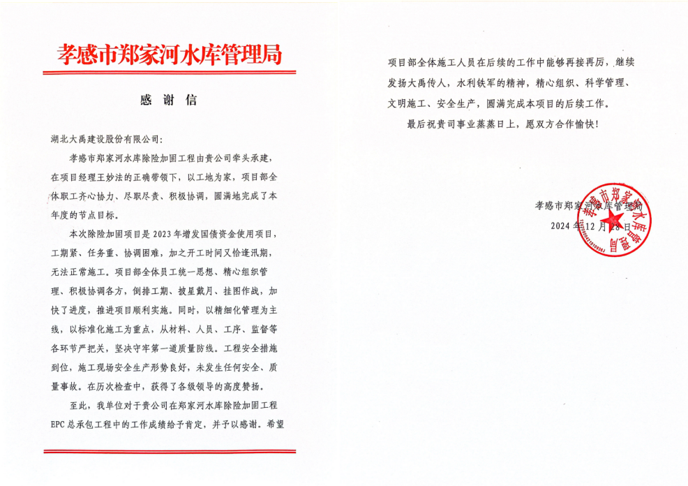 孝感市郑家河水库除险加固工程收到了孝感市郑家河水库管理局发来的感谢信,信中对公司在郑家河水库除险加固工程epc总承包工程中的工作成绩给予肯定,并予以感谢。信中希望项目部全体施工人员在后续工作中再接再厉,精心组织、科学管理、文明施工、安全生产,圆满完成本项目的后续工作。
