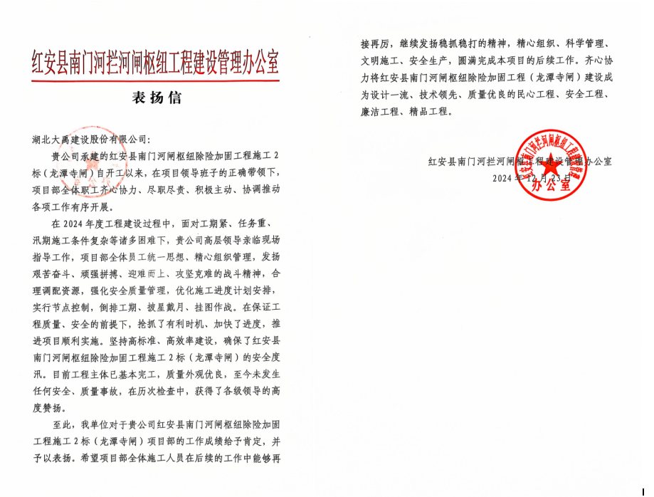 红安县南门河闸枢纽除险加固工程施工2标(龙潭寺闸)项目收到红安县南门河闸枢纽工程建设管理办发来的表扬信,信中表示,项目部克服不利因素,积极调配资源,充分发挥了管理优势,彰显了铁军精神和责任担当。希望项目部全体施工人员齐心协力将红安县南门河闸枢纽除险加固工程(龙潭寺闸)建设成为设计一流、技术领先、质量优良的民心工程、安全工程、廉洁工程、精品工程。