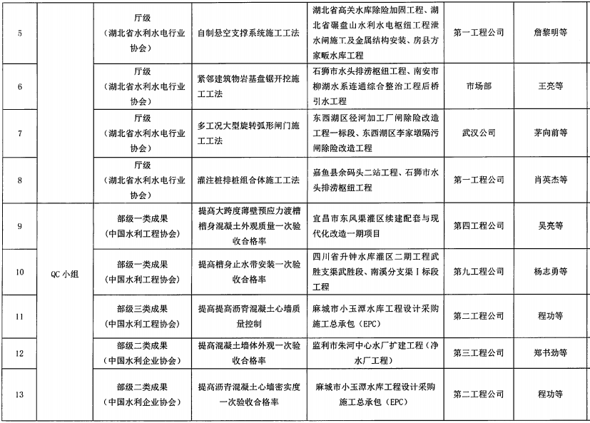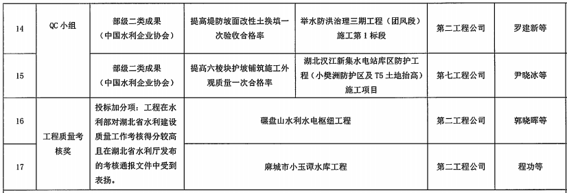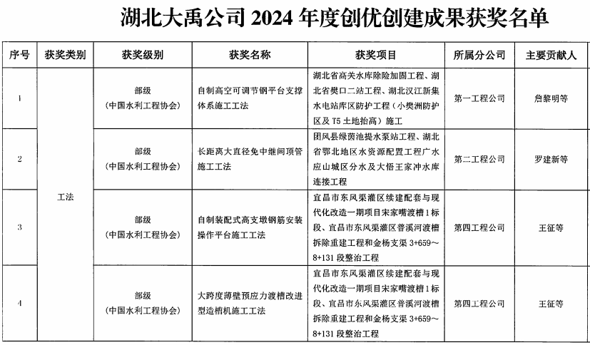 2024年,公司创优创建活动蓬勃开展,取得了较好的成绩。根据公司发展规划要求及行业市场信誉、业绩需要,为进一步提升公司软实力,鼓励全体员工积极投入到创优创建活动中来,勇于创新、勤于创建,为公司未来发展作出更多贡献。根据《湖北大禹建设股份有限公司关于印发2023年质量创优奖惩办法的通知》,现决定对2024年度获奖单位及个人进行表彰奖励,名单如下: