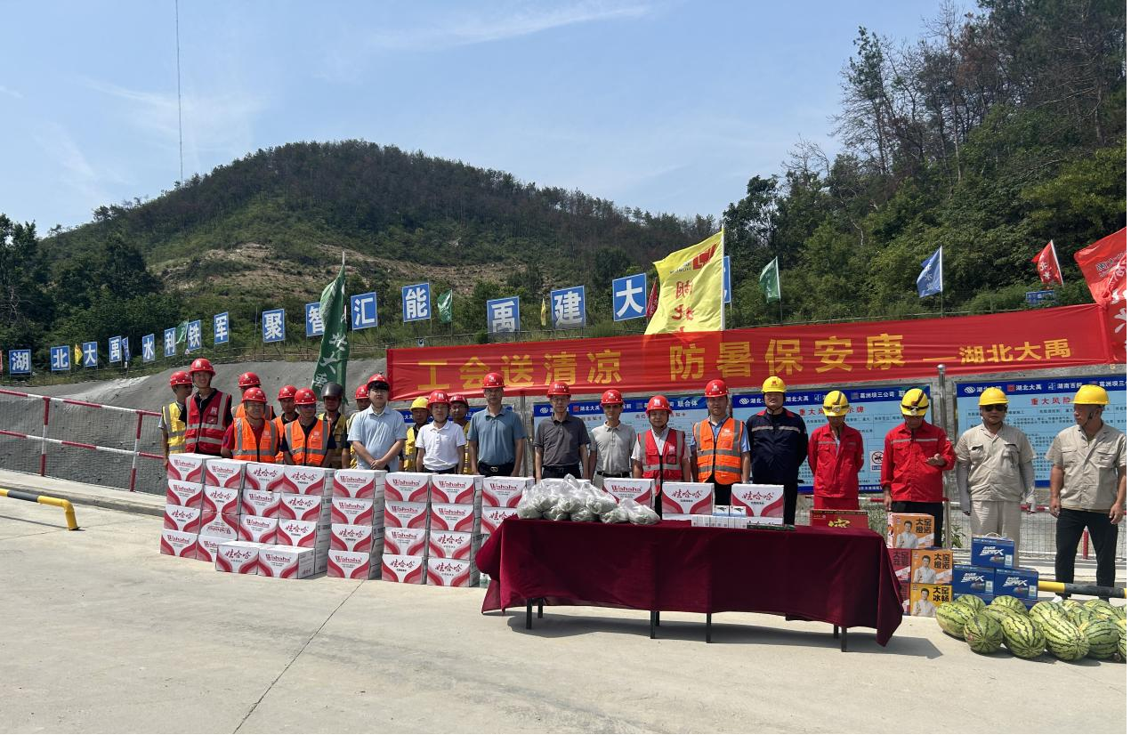 盛夏时节,烈日炎炎,为保证一线员工的身体健康和施工安全,7月18日上午,公司总经理袁水斌赴鄂北地区水资源配置二期工程孝昌段项目开展“工会送清凉,防暑保安康”慰问活动。公司生产管理部、第一工程公司相关负责人及项目部全体成员参加了慰问活动。